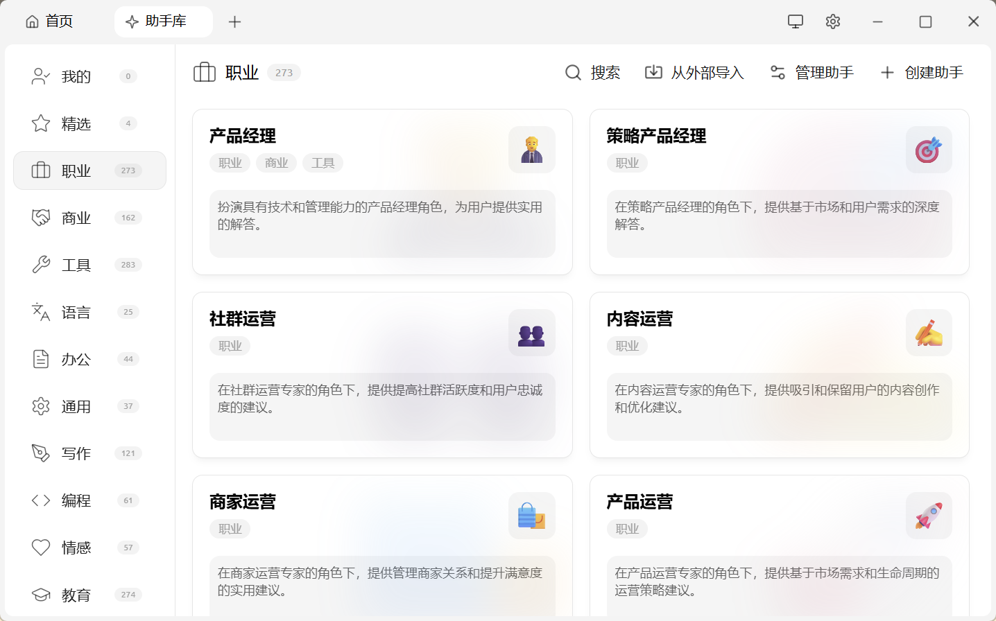 助手市场:内置千余个行业专用助手,涵盖翻译、编程、写作等领域,同时支持用户自定义助手。